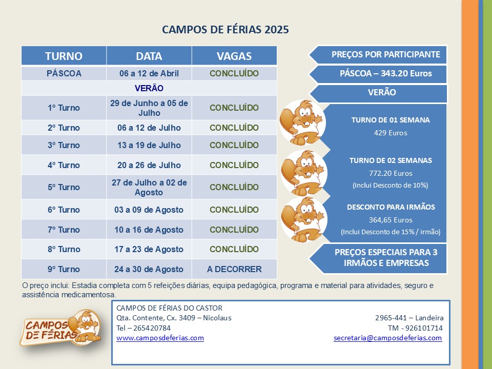 As nossas actividades de Campos de Férias, destinam-se a crianças e Jovens com idades compreendidas entre os 06 e os 17 anos. Para além dos tradicionais jogos de futebol, e voleibol, os participantes podem ainda fazer: Karts, Lasergames, Seringaball, Jogos aquáticos, slide, Pontes de cordas, Ponte do Indiana Jones, Orientação, Tiro com arco, Stand up Paddling, Canoagem, Jangadas e outras divertidas actividades tais como jogos de exterior (diurnos e nocturnos).